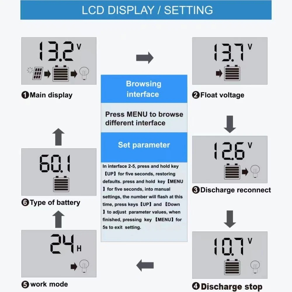 این تصویر مراحل و منوهای اصلی تنظیمات کنترلر شارژ را نمایش می‌دهد. ترتیب نمایش داده‌ها به شکل زیر است: