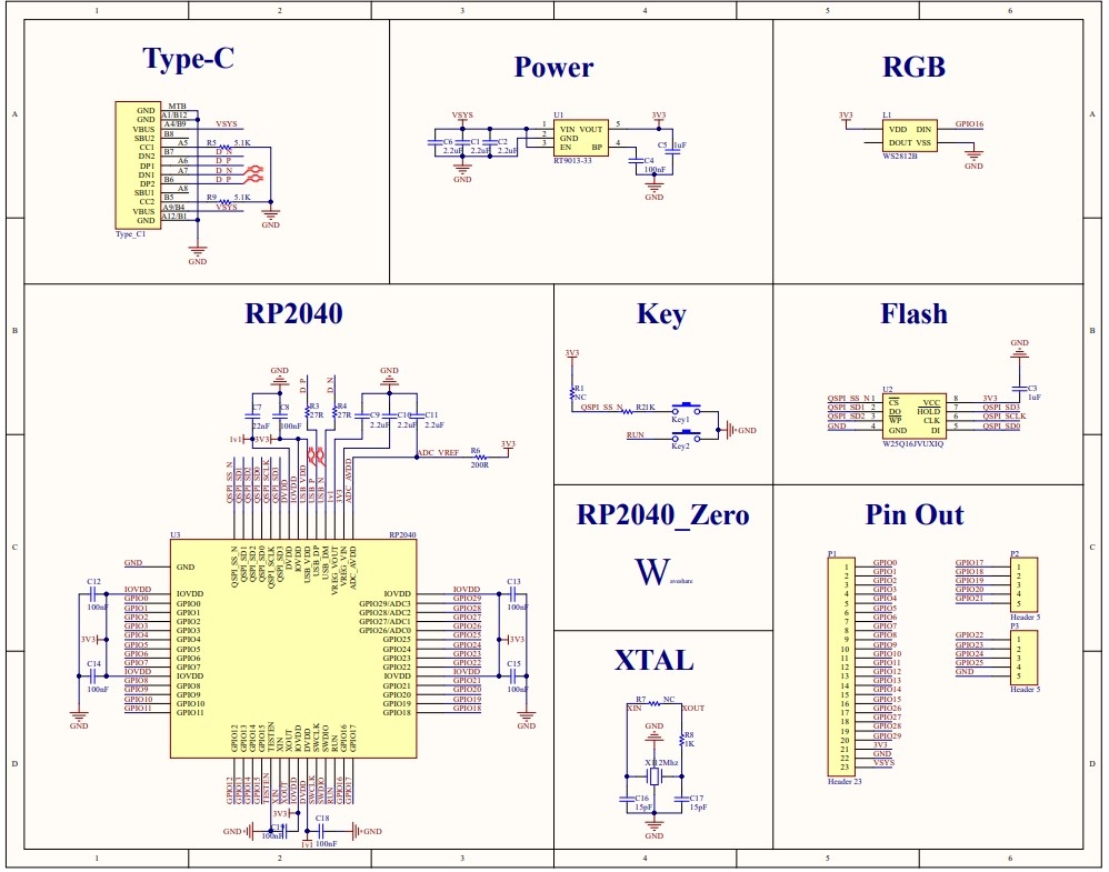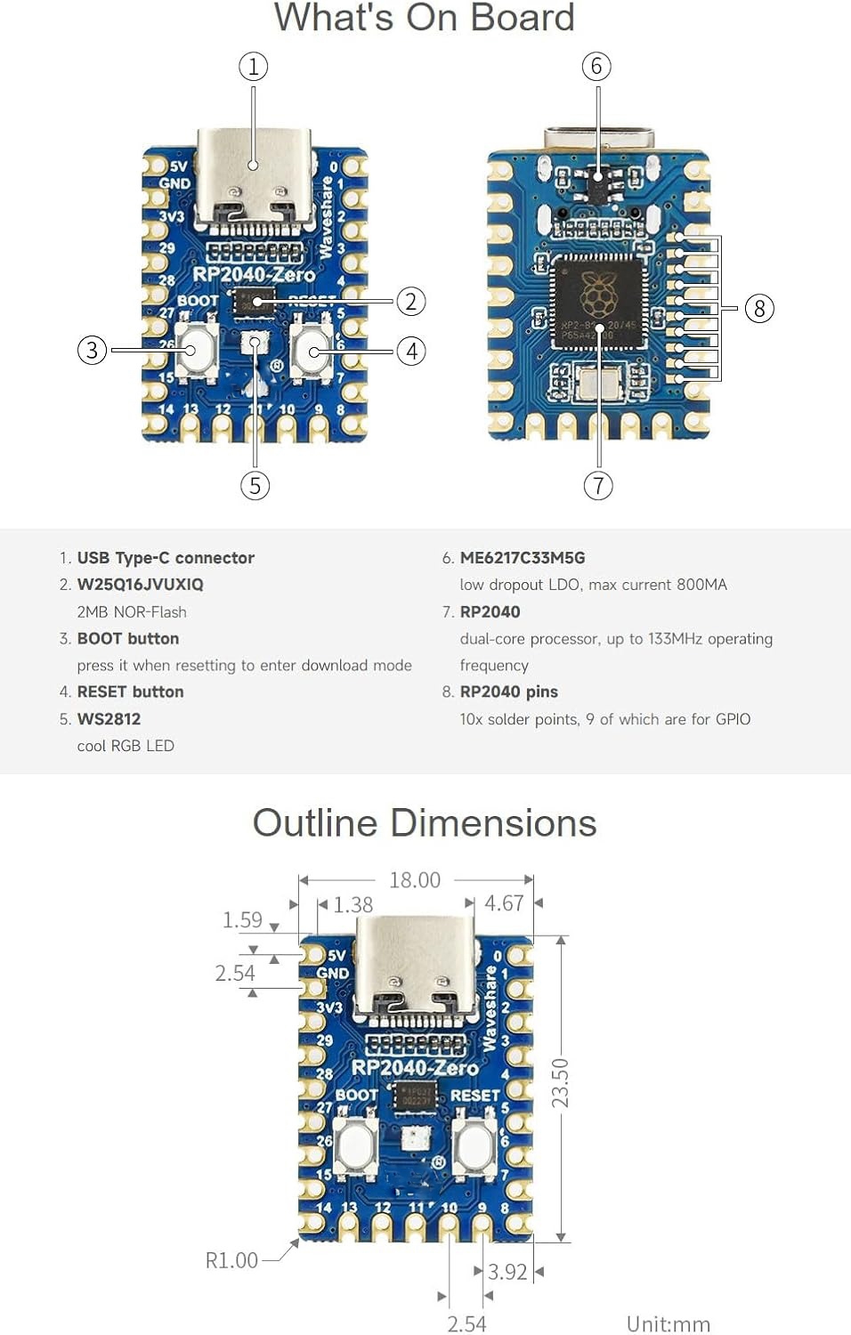 The RP2040-Zero is a scaled-down version of the Raspberry Pi Pico family, based on the original RP2040 chip. It features two ARM Cortex-M0+ cores clocked at up to 133MHz, and with 264KB of SRAM and 2MB of flash, it can run relatively heavy programs with low power consumption.