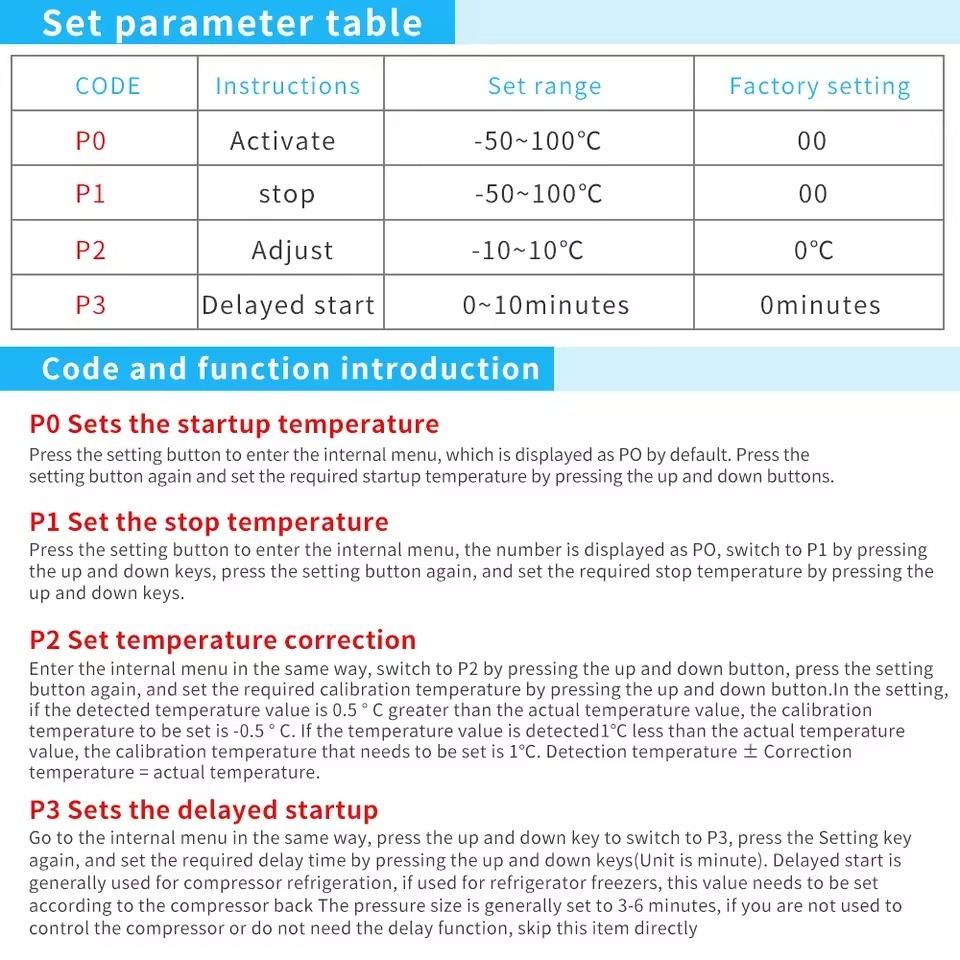 The XK-W2001 digital thermostat is a very practical socket temperature controller that connects directly to the mains power without the need for wiring and turns the device connected to its socket on and off. This model uses a waterproof NTC10K sensor with a length of about 1 meter and controls a wide temperature range of +110 ~ -50 °C with an accuracy of ±0.1 °C. It also has a start delay to protect electrical equipment.