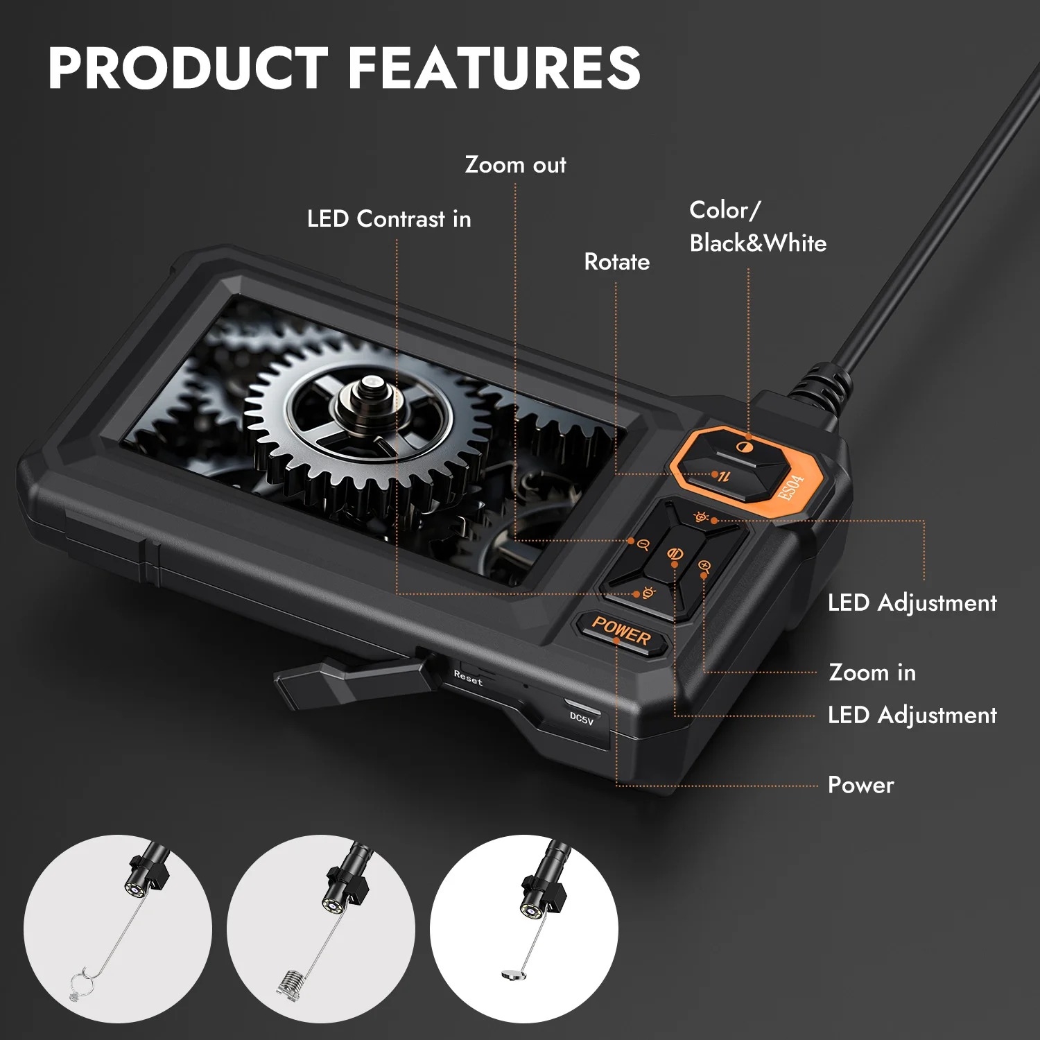 The ES04 Industrial Endoscope is a portable visual inspection tool designed for real-time observation and fault detection in narrow, dark, and inaccessible spaces. Equipped with a compact CMOS-based camera positioned at the tip of a semi-rigid flexible cable, the device transmits live video directly to its integrated display—eliminating the need for external monitors or smartphones.High-intensity adjustable LED lights are integrated around the lens to ensure clear visibility in low-light environments such as inside pipes, automotive engines, ventilation ducts, wall cavities, and industrial equipment. The brightness level can be easily adjusted to optimize image clarity while minimizing glare in reflective surfaces.