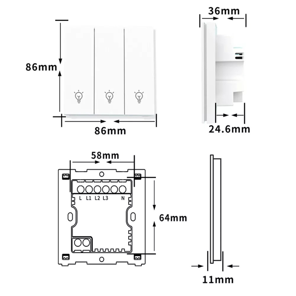 Multifunctional Wall Switch: Designed as an 86-channel wall switch, it fits seamlessly into any decor, while maintaining its sophisticated appearance and function.
