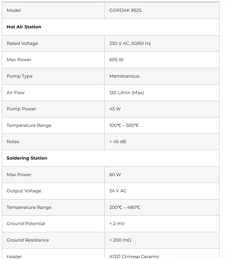 The GORDAK 952S also includes safety and convenience features such as a temperature control knob with lock function, fault self-diagnosis with error codes, and an intelligent automatic cooling system that continues airflow until temperatures drop below 50℃ before shutting down. Additionally, the unit offers a USB 5 V / 700 mA output for charging compatible devices, making it a versatile and practical choice for professional electronics technicians.