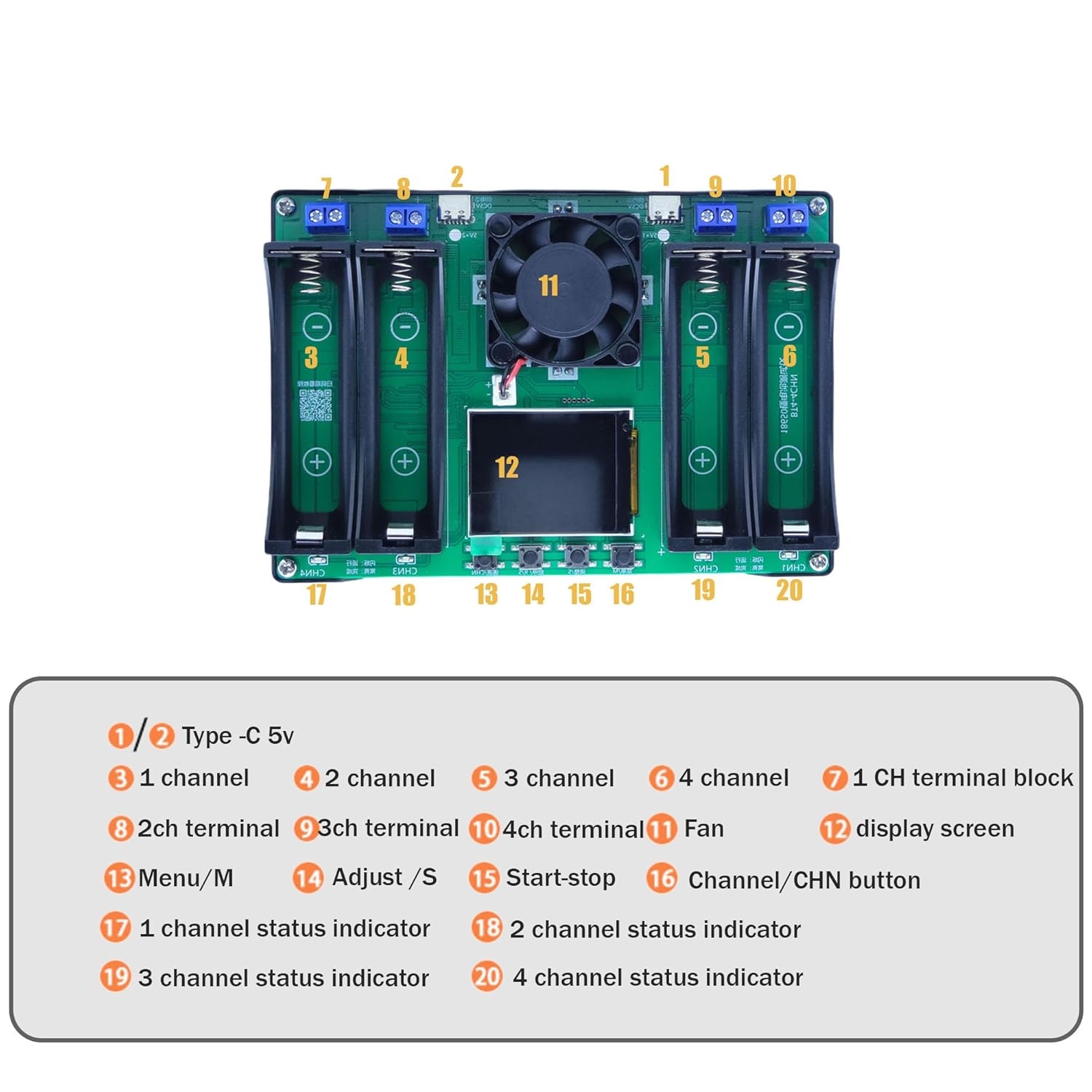 ماژول تست چهار کاناله باتری لیتیوم 18650 ، ابزاری حرفهای جهت اندازهگیری ظرفیت واقعی (mAh)، انرژی (mWh)، مقاومت داخلی (mΩ) و تحلیل عملکرد باتریهای شارژی است. طراحی دقیق این برد شامل نمایشگر رنگی، فن خنککننده، دکمههای کنترلی و شیارهای مستقل باتری است. در این تصویر، اجزای اصلی برد شمارهگذاری شدهاند که عملکرد هر یک بهشرح زیر است: