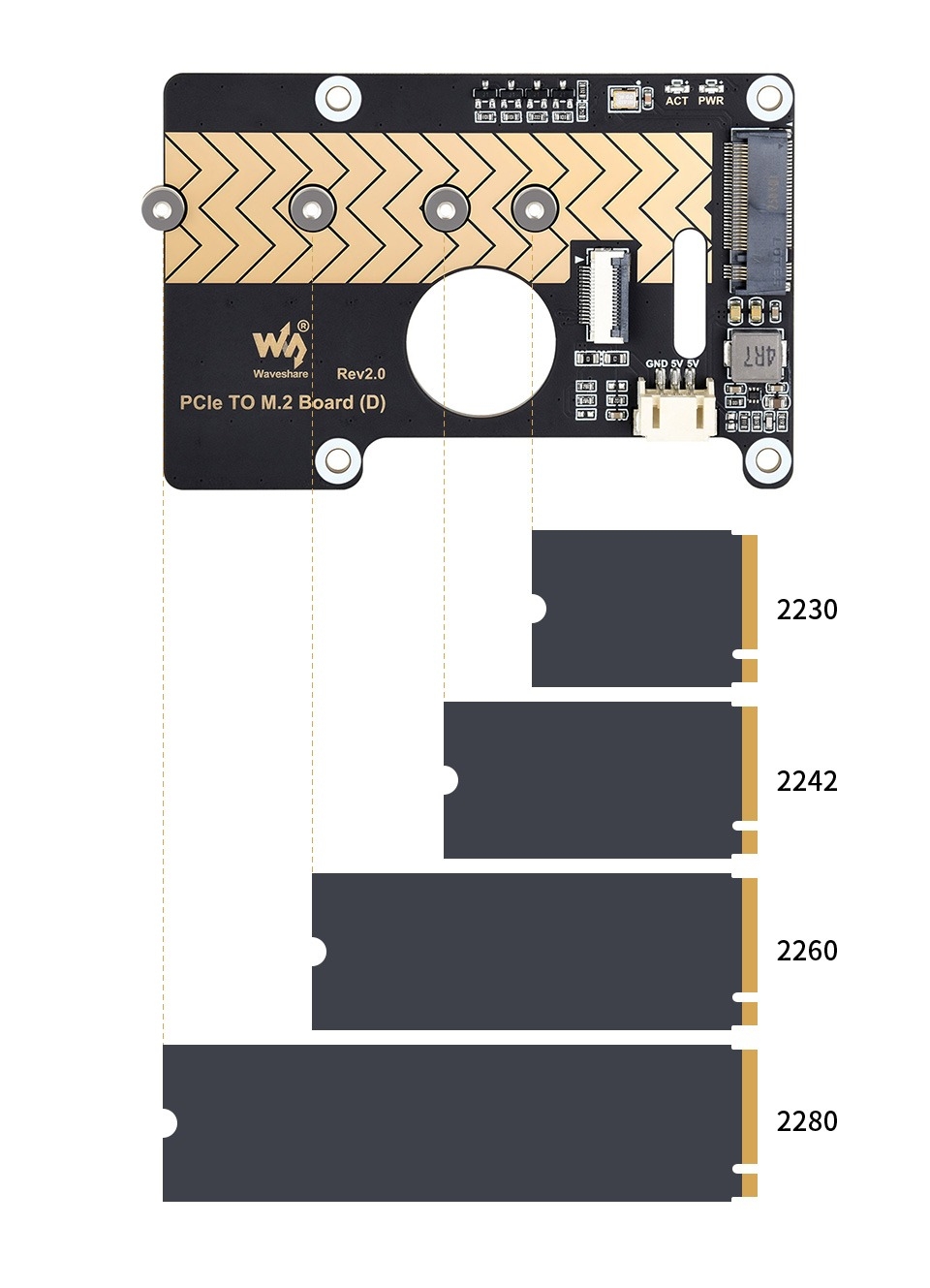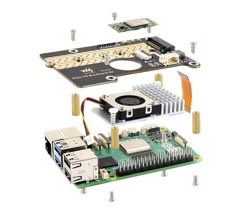 این تصویر نمای انفجاری (Exploded View) از نحوه مونتاژ کامل برد PCIe To M.2 Board (D) روی Raspberry Pi 5 را نشان میدهد. در بالاترین بخش، SSD نوع M.2 NVMe روی اسلات Key-M برد آداپتور نصب شده و با پیچ در جای خود ثابت میشود. خود برد PCIe دارای محلهای پیچ قابل تنظیم برای پشتیبانی از طولهای مختلف SSD (2230 تا 2280) است. در سمت راست برد، کانکتور اتصال کابل فلت PCIe 16-PIN دیده میشود که به رابط PCIe روی Raspberry Pi 5 متصل میگردد.