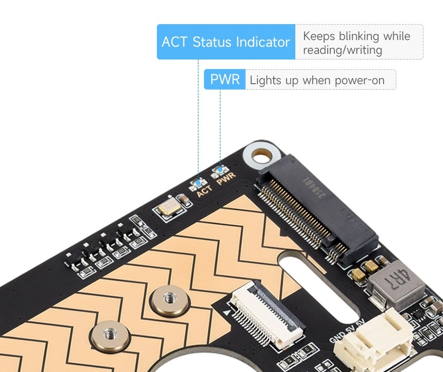The design of this module is optimized and industrial. The connection is made via a 16PIN PCIe FFC cable, and if necessary, a 3PIN auxiliary power connector can be used to provide stable current. Two status LEDs on the board make it easy to display the activity and working status of the SSD. The use of Immersion Gold coating in the PCB construction improves the quality of the connection, reduces oxidation, and provides greater stability in data transfer. This board is an ideal option for turning the Raspberry Pi 5 into a minicomputer with high-speed memory for small servers, AI projects, network attached storage (NAS) systems, and industrial applications.