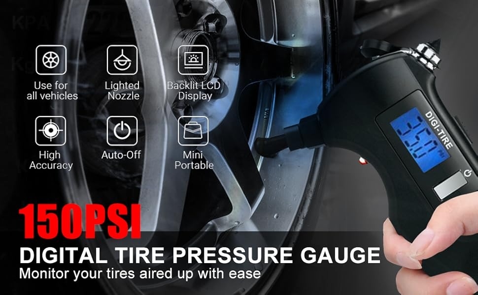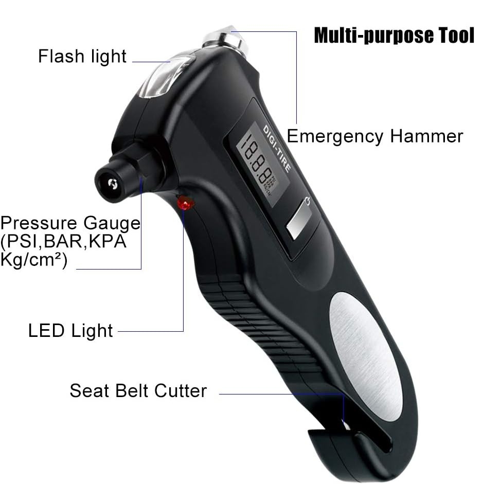 The Flashlight with Tire Gauge Emergency Multi-Tool is a complete and essential emergency tool for your car that combines several important functions in one device: accurate tire pressure measurement, LED flashlight, blue display backlight, glass breaker, and seat belt cutter. This tool is practical and portable for emergencies, traveling, driving on the road, and even periodic tire checks.