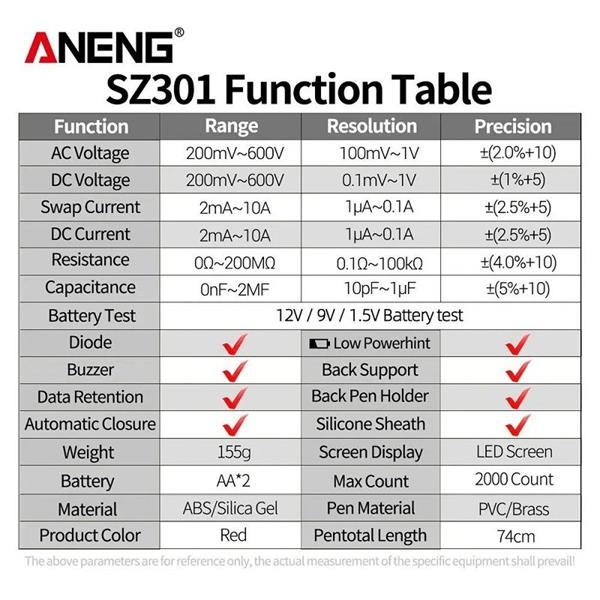 The ANENG SZ301 is a versatile auto-ranging digital multimeter designed for general electrical and electronic measurement tasks. With a clear LED display and a maximum count of 2000 counts, it delivers reliable readability and precise measurement results for workshop, educational, and maintenance environments.